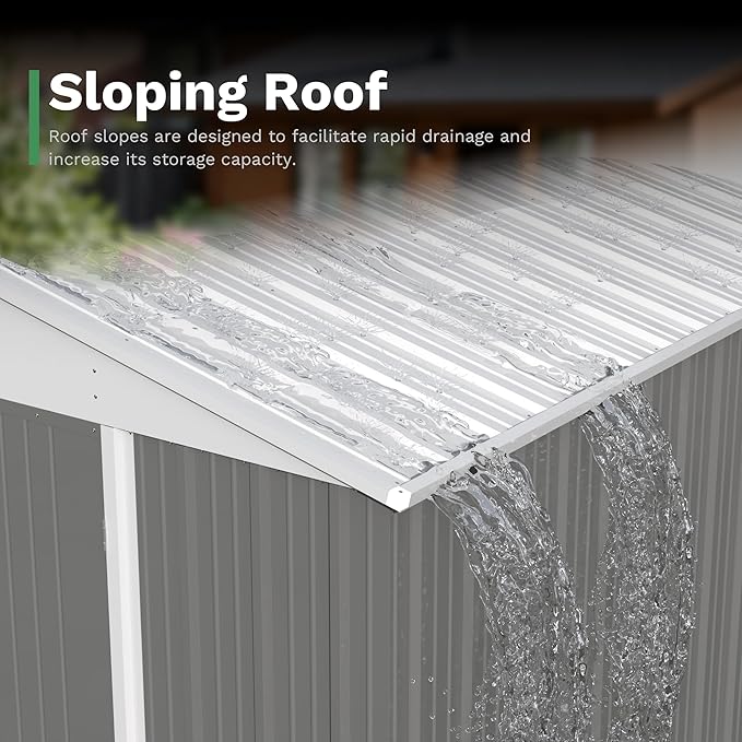 - [Unique Design]: The outdoor storage shed is equipped with a lockable door, ensuring security and facilitating convenient access to stored items. The slooping roof design offers enhanced storage capacity while mitigating the risk of rainwater accumulation.