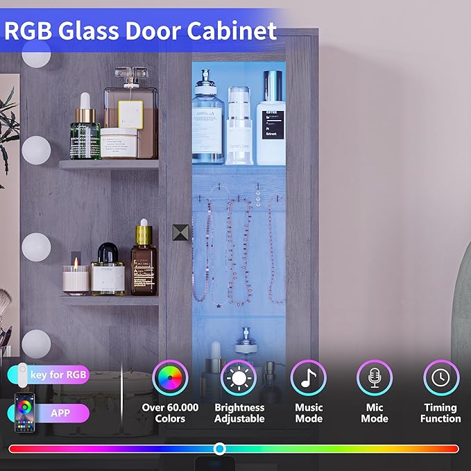 - 【GLASS CABINET WITH RGB LED LIGHTS】The makeup vanity is equipped with 3-layer glass display cabinet, and there is RGB LED light on the cabinet top, which can be controlled via APP or the switch. With multiple dynamic modes, such as music mode, microphone mode and timing function. You can change LED light flashing with the rhythm of music. Behind the cabinet of vanity mirror with lights, hidden jewelry racks can be used to store your rings, necklaces and earrings, making your jewelry look organized.