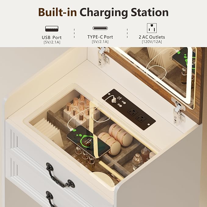 - 【Ample Storage Space】: Compact Vanity with glass top instantly reveals your perfume, jewelry, and other items in the drawers, eliminating the need for searching. The velvet jewelry drawer provides compartmentalized storage and protects your jewelry from scratches. The cushioned chair provides the perfect space for extended makeup and skincare sessions. This farmhouse led vanity table is suitable for bedrooms, apartments, living rooms