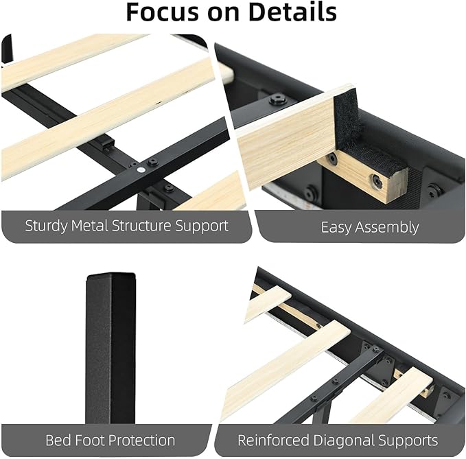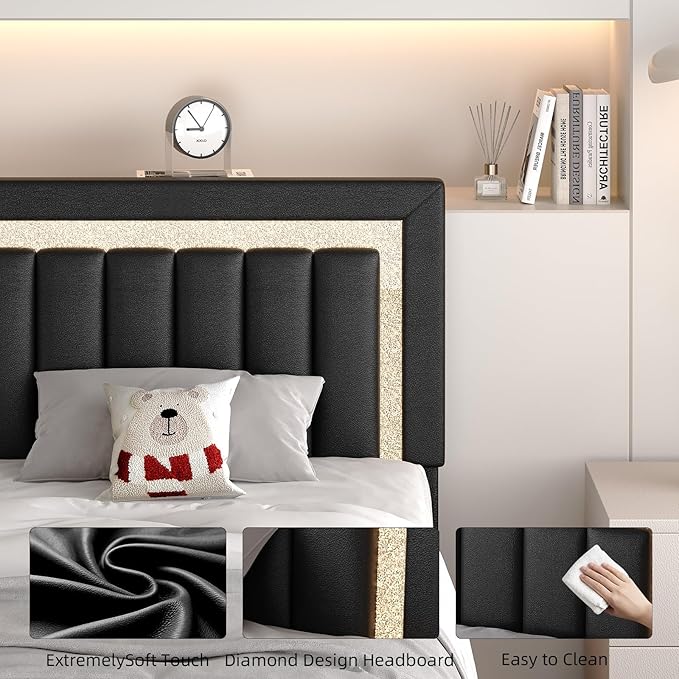 - Faux Leather Upholstered: Premium scratch-resistant faux leather upholstered covers the diamond headboard and bed platform. Waterproof and easy to clean with a damp cloth.