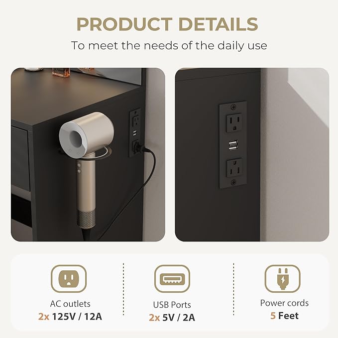 - 【Well-designed Functions】Charging station of vanity table has 2 standard sockets and 2 USB ports, which is convenient for you to use the hair dryer and charge other mobile devices. The hair dryer holder of the dressing table is convenient for you to store the hair dryer.