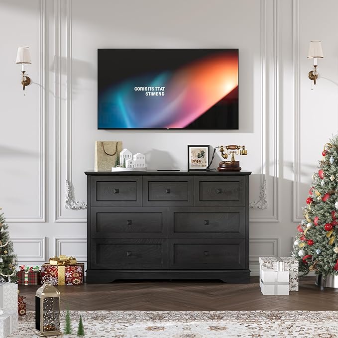 Farmhouse 7 Drawers Dresser for Bedroom with Charging Station, Wide Black 7 Chest of Drawers, Wood Dressers Organizer for Closet, Modern Storage Organizer Cabinet for Living Room,Hallway & Entryway