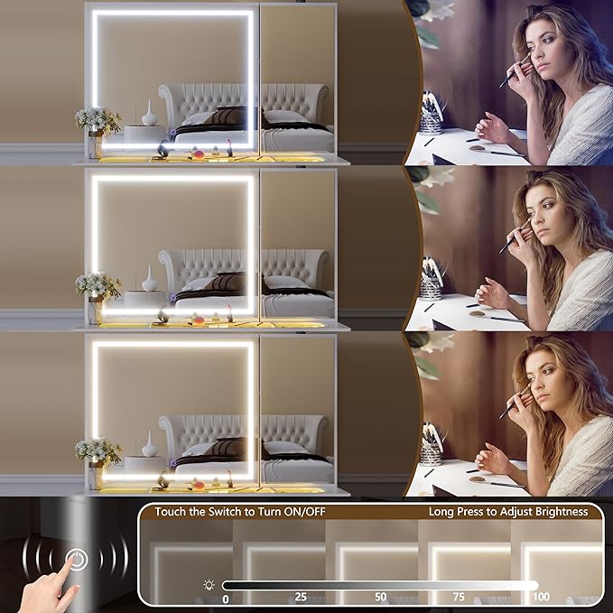 - 【White Vanity with Extra Large Lighted Mirror】---This makeup vanity is equiped with large mirror: 40''L * 25.6''H, the oversized mirror can provide an ultra-comprehensive field of vision, showing all angles perfectly. With a narrow bezel design, the oversized mirror provides a fuller view and perfect presentation of all angles. A better illumination strip is used instead of bulbs, and the strip is infinitely dimmable
