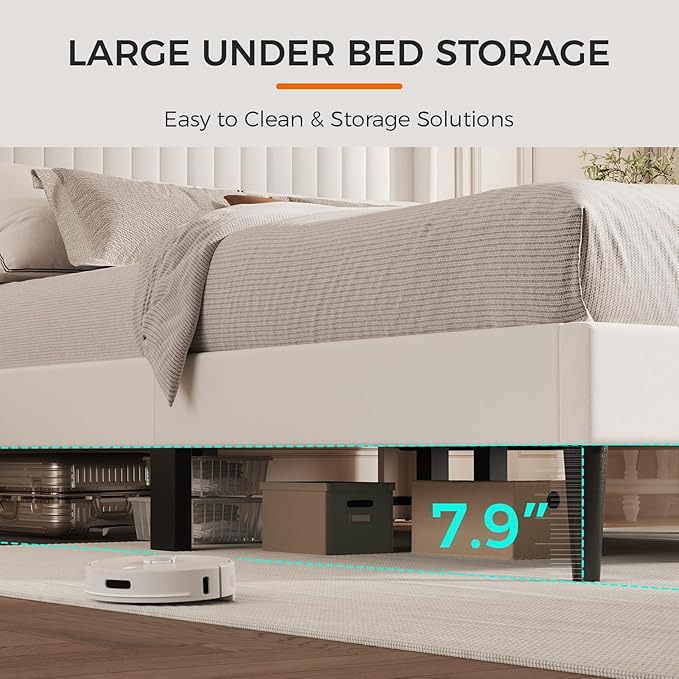 - 【Under-Bed Storage & Robot Vacuum Friendly】With a 7.9-inch clearance, this queen platform bed frame offers space for shoes, boxes, or seasonal items. The height also allows most robot vacuums to pass underneath for effortless cleaning.