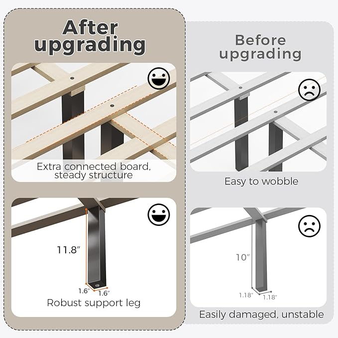 - 【Fits Standard Queen Mattresses】Designed for queen size mattresses 8–14 inches thick, this platform bed provides firm support with no box spring needed. Compatible with memory foam, hybrid, and latex mattresses.