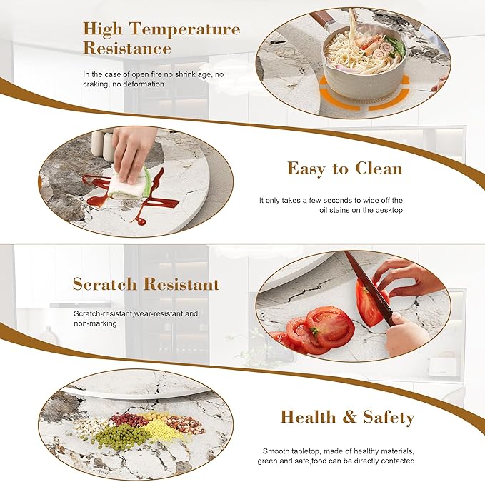 - ANTI-COLLISION: The marble tables for dining room adopts a circular arc design, the arc is natural and uniform, smooth and smooth, showing the soft aesthetic design, easy to care, high temperature resistance, not easy to scratch.