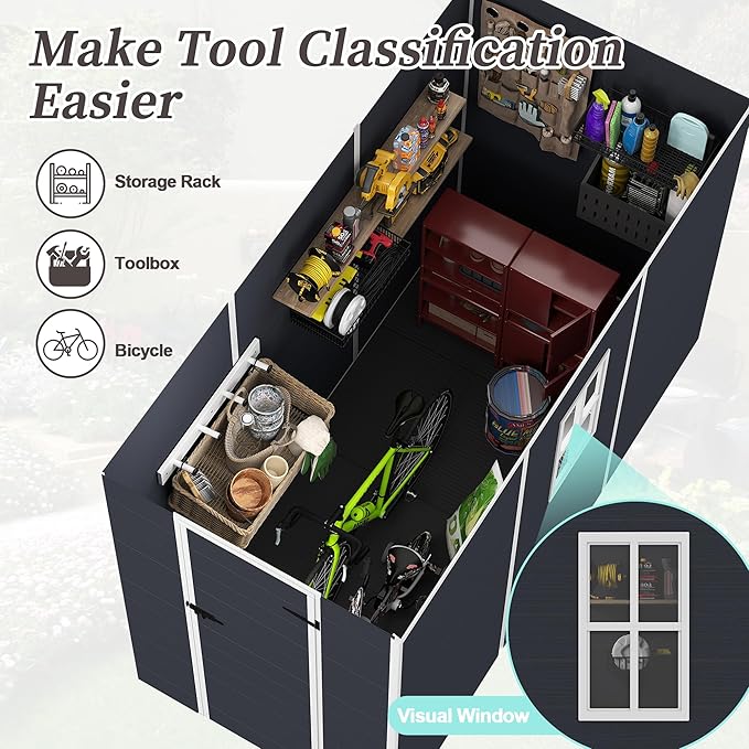 - 【Functional Design】This outdoor waterproof storage shed features a pitched roof design to effectively prevent water accumulation. The lockable door enhances security and prevents small animals from accidentally entering. The design incorporates vents, a window, and a top light-emitting board to ensure ample natural light and ventilation. This not only makes your tools clearly visible from the outside but also enhances the overall aesthetic of the shed