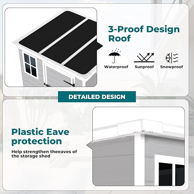 - 【Durable Construction with Floor】Constructed with extra-thick, double-wall polypropylene resin and reinforced with steel, this shed is durable enough to withstand harsh weather conditions. The impact-resistant floor effectively keeps out rain and pests. This design makes the outdoor storage shed corrosion-proof, moisture-proof, and resistant to both wind and impact, ensuring your belongings remain intact even in severe weather