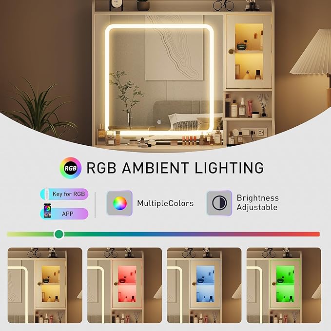 - RGB Cabinets: The vanity desk features two RGB cabinets with customizable lighting colors, adding a touch of modern flair to your space. 3 drawers give you more storage space and make your room look clean and tidy