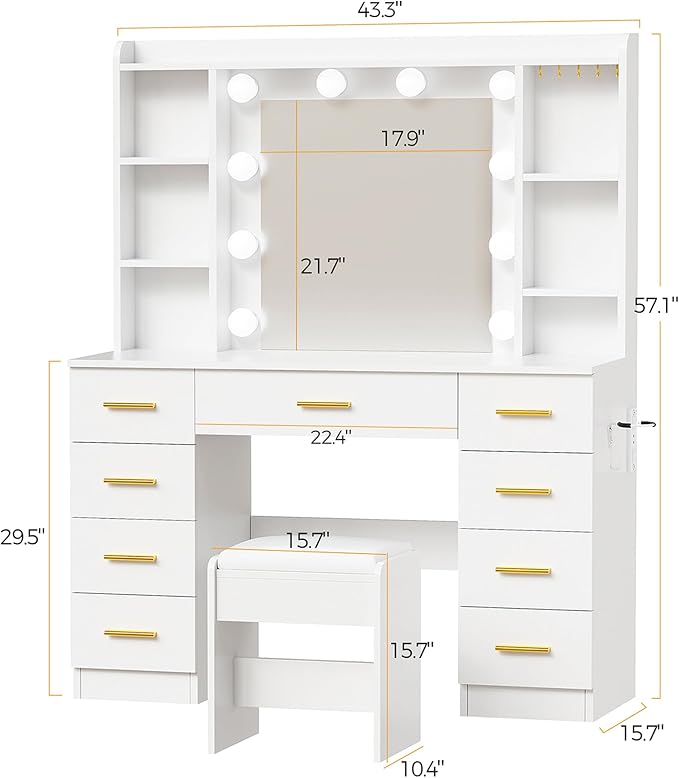 - LARGE STORAGE CAPACITY: The vanity desk with mirror and lights includes 9 large drawers, 5 jewelry hooks, 6 open storage shelves and 1 large tabletop; All your cosmetics and skin care products can be sorted and stored tidily to the white vanity with lights; You can say goodbye to the small and messy table and enjoying a better life with our girls vanity set with mirror and stool and lights