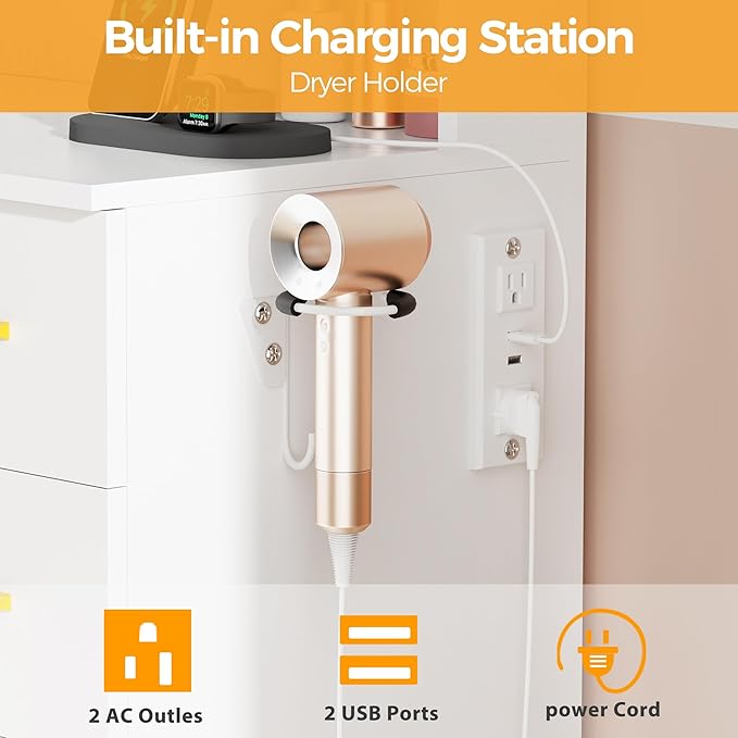 - BUILT-IN CHARGING STATION & HAIR DRYER RACK: Large makeup vanity desk with lights comes with 2 standard power outlets and 2 USB ports; It can charge hair dryers, cell phones and other electronic devices at the same time and makes your makeup more convenient and efficient