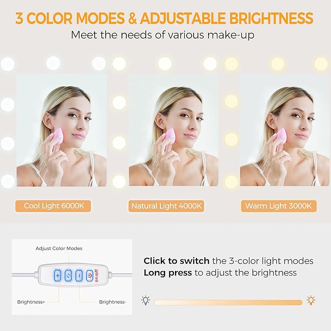 - HD LIGHTED MIRROR & 3 COLOR LIGHTING MODES: This vanity mirror with lights desk and chair has adjustable brightness and 3 lighting modes, touch the switch to turn off or adjust the modes: (warm, natural, cool), touch to adjust the brightness; Dressing up in front of such a multifunctional modern white vanity with lighted mirror can create a good mood; LED lights also protect your eyes