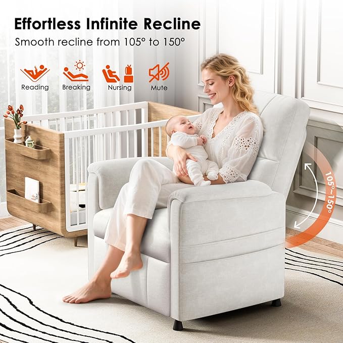 - 【Comfort Upgrade, Skin-Friendly Experience】: The recliner chair for small spaces has a 23.2" (55cm) seat cushion, 26.2” (66cm) raised armrest and 62"(165cm) stretching space, and an ergonomic segmented backrest design, high-resilience sponge layer, independent spring bag support, provide precise support for your body. With velvety skin-friendly chenille fabric, it feels smooth and breathable, suitable for all seasons