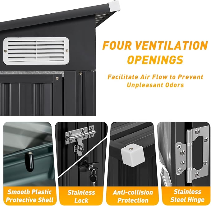 - Galvanized Steel Panels for Unmatched Strength and Durability: Crafted from high-strength galvanized steel, the panels of this tool shed are built to last. They effectively resist rust, ensuring long-term durability even in harsh outdoor conditions. Meticulously engineered for structural integrity, these panels offer exceptional compressive strength, providing a stable and safe storage solution for garden sheds, generator storage, and more.