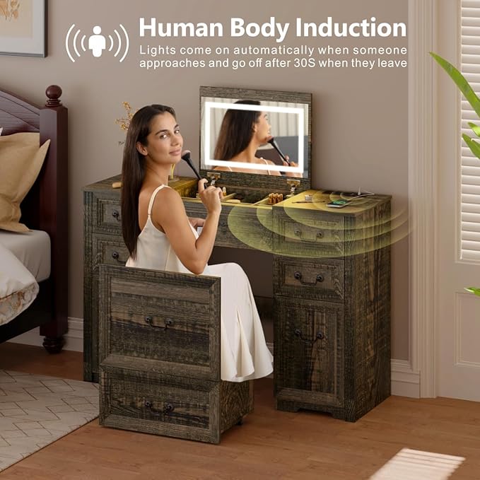 Farmhouse Vanity Desk with Flip up Vanity Mirror and Lights,Rustic Makeup Vanity with Charging Station and Hidden Drawer,Vanity Table Set with Drawers/6-Compartment/Cabinets, Rustic Oak