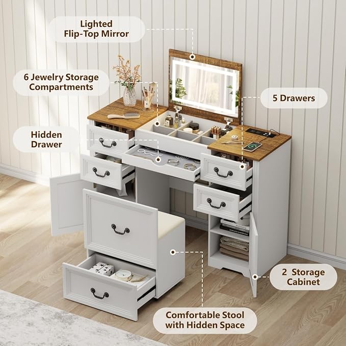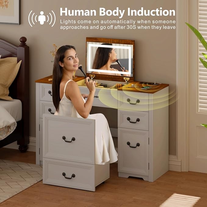 Farmhouse Vanity Desk with Flip up Vanity Mirror and Lights,Rustic Makeup Vanity with Charging Station and Hidden Drawer,Vanity Table Set with Drawers/6-Compartment/Cabinets,White