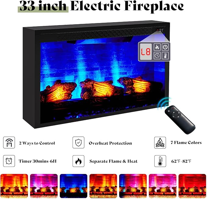 - 33" Electric Fireplace: 7 flame colors, 5 brightness levels, 62℉-82℉ temperature adjustable and independent flame operation for year-round use. It heats spaces up to 400 sq.ft. Timer (30 min-6H) and overheat protection save energy and ensure your family's safety