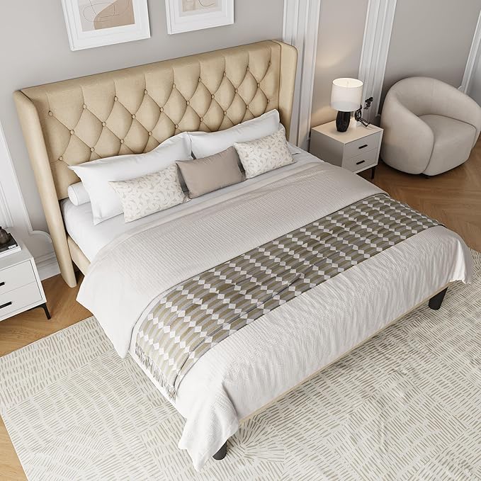 - Luxurious Wingback Design: This upholstered bed frame features an elegant button-tufted headboard with winged sides, providing both comfort and practicality. The soft, breathable linen fabric offers a cozy surface to lean against, while the winged sides help secure pillows and serve as a convenient top shelf for glasses or phones. The timeless design complements a variety of bedroom styles