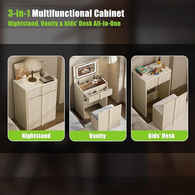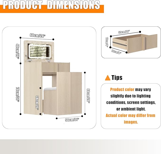 - 【Flip Top Makeup Vanity】The space-saving design features a thick-cushioned seat for comfort. The integrated stool stores completely under the desk (only 0.2㎡ footprint), while widened wooden handles ensure easy movement and design continuity. Designed for convenient makeup access, this makeup vanity desk with lights streamlines your daily routine