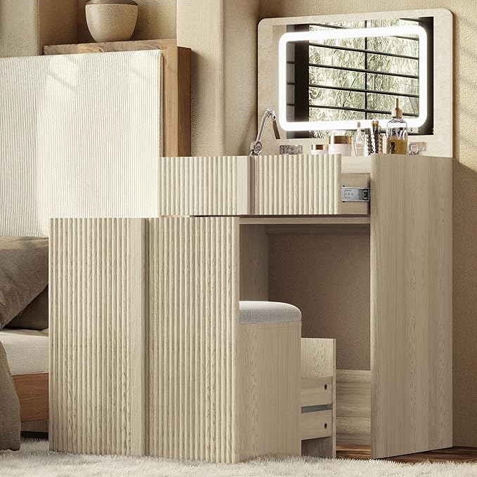 - 【Sleek Curved Vanity with Chair】 The arc-shaped 3 in 1 vanity desk with mirror and lights enhances bedroom ambiance with its soft contours. Featuring 3D wave-groove detailing and marble-finish surfaces, crafted from engineered wood, it brings together minimalist aesthetics with practical function. Rounded corners provide added safety, while its versatile design complements various decor styles from contemporary to classic