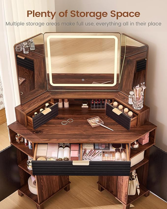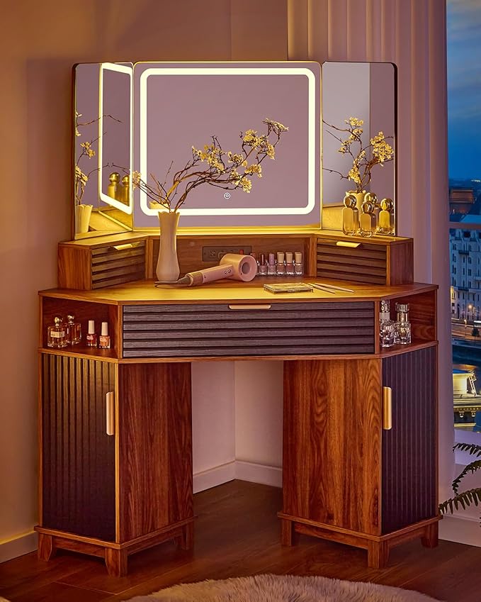 AOGLLATI Large Fluted Corner Vanity Desk with HD Triple Mirror and Lights, Makeup Vanity Desk with 3 Drawers & 3 Cabinets, Modern Dressing Table with Charging Station for Bedroom, Black