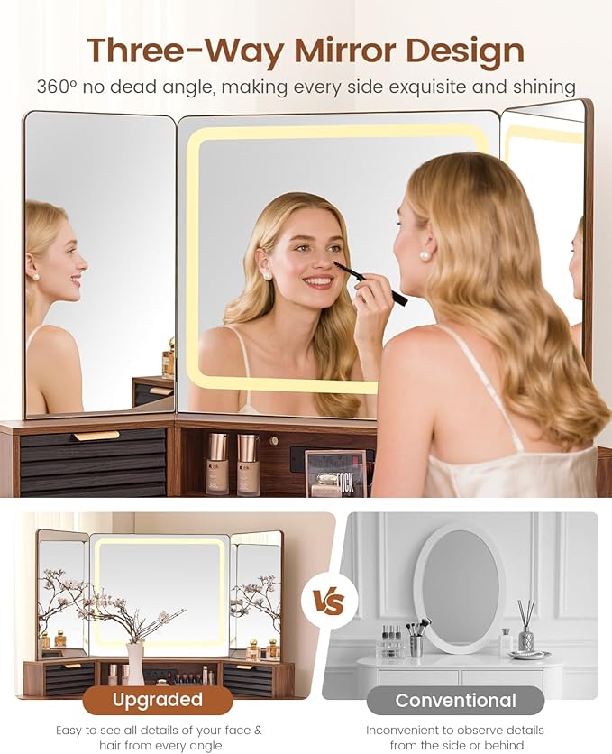 - 【360°Full-View Fixed Three-Panel Mirror】Fixed three-panel mirror offers an almost 360°view, ensuring you can see every detail of your face, hair, and overall appearance. Equipped with adjustable LED lighting in 3 colors—cool light is bright, helping you spot imperfections.