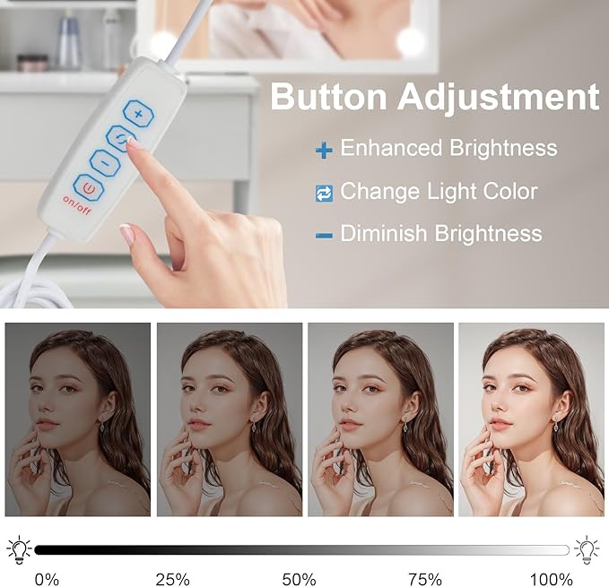 - 【Hidden Spaces & Adjustable Light】The vanity comes with a push-pull mirror, allowing you to use a hidden storage space while shining your beauty. The LED has three color light modes of warm yellow, warm white and cold white, and the brightness of each color can be adjusted. Make your makeup process fast and professional. Switch your beauty with a touch of your finger.