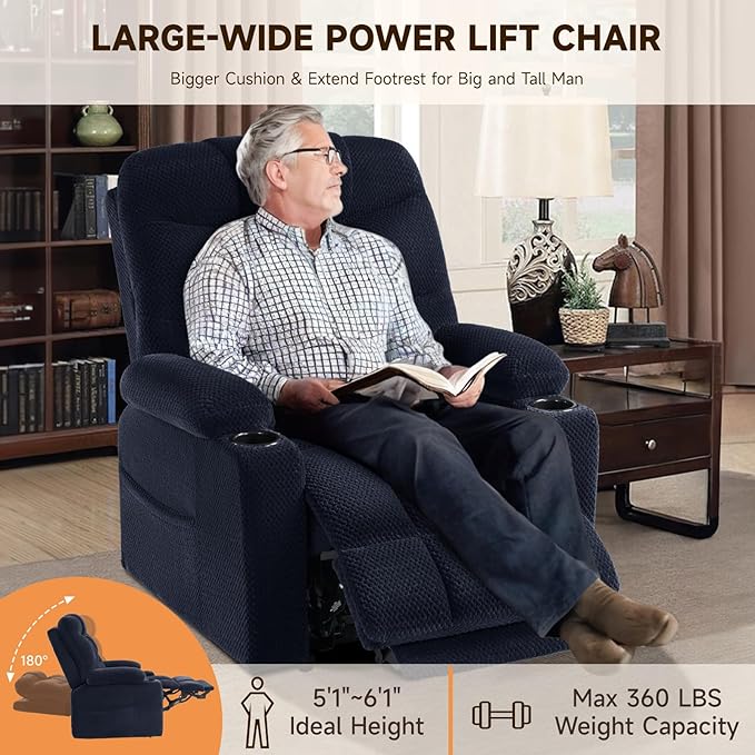 - 【Large & Wide】- Our power lift chair suitable for big and tall 5'4”-6'1”, extended footrests to fully support your feet, prevent from dangling. The cushion 21.8"x23.2", providing ample space and comfort.