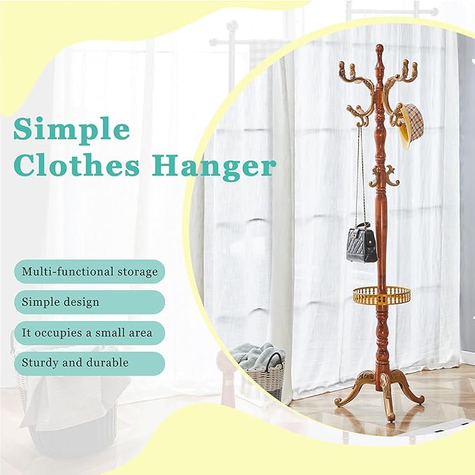 Solid Wood Coat Rack Freestanding, 77" Adjustable Hall Tree Hanger With Hooks, Coat Hanger Stand for Hanging Clothes Bags Hats in Living Room Bedroom