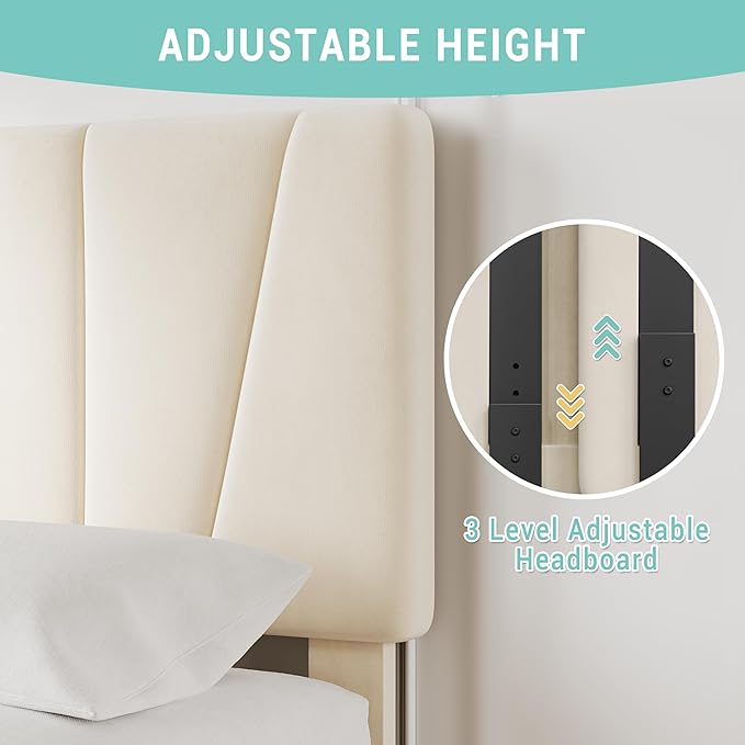 - ๐ Adjustable Headboard (42.9"-45.7") โ Customize your twin size bed frame by raising or lowering the headboard to fit mattresses 8"-14" thick, ensuring ergonomic support for reading or lounging.