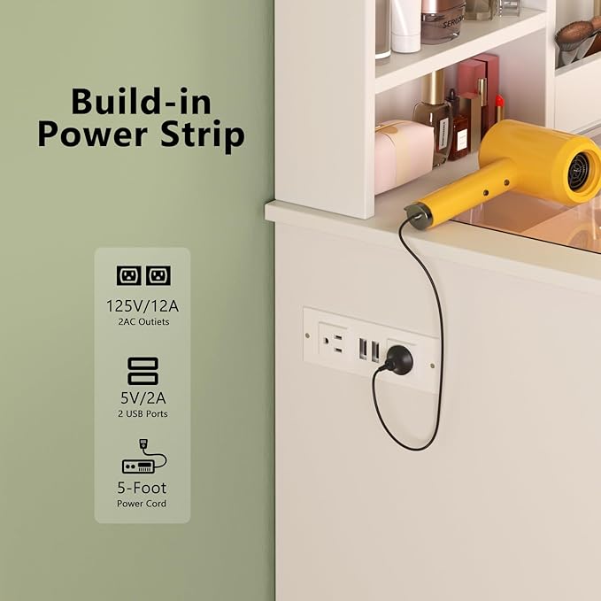 - Built-in Power Outlet & USB Ports – Style and Charge at the Same Time: Equipped with 2 power outlets and 2 USB ports, this white vanity with mirror and lights lets you use a hair dryer, curling iron, and charge your phone or tablet simultaneously. No more messy extension cords—enjoy a cleaner, faster, and more efficient routine.