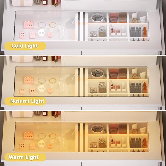 - Panoramic Glass with LED Lighting – Showcase Your Beauty Collection: This makeup vanity with glass top features a high-transparency tempered glass surface and transparent side cabinets with built-in LED strips. Even without opening drawers, cosmetics and jewelry sparkle brilliantly under the lights. The panoramic LED lighting syncs with the tri-color mirror light, helping you find items faster and display them like a boutique collection.