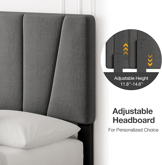 - Adjustable Headboard for Custom Comfort: Featuring an adjustable headboard that ranges from 42.9 to 45.7 inches in height, this full bed frame accommodates mattress thicknesses between 8 and 14 inches. Tailor the headboard to your preferences for added comfort and style
