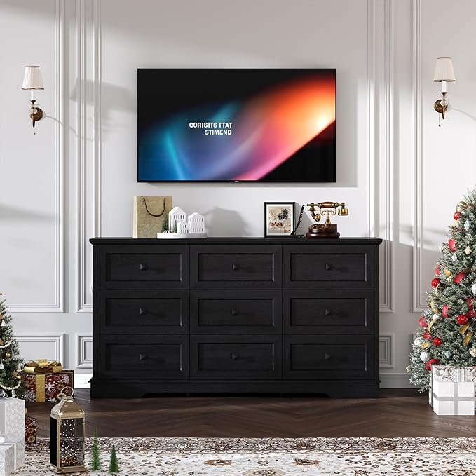 Farmhouse 9 Drawers Dresser Chests for Bedroom, Black 9 Drawers TV Stand, Long Wood Dressers Organizer for Closet, Modern Storage Organizer Cabinet for Bedroom, Hallway & Entryway