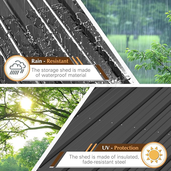 - Sturdy Shelter: The metal shed is made of galvanised steel with higher tensile strength and hardness, and the structure of the shed is in accordance with the mechanics, which ensures the solidity and stability of the shed. We have also optimised the safety of the shed. We provide plastic protective caps for each screw to prevent anyone from being injured by the exposed screws.