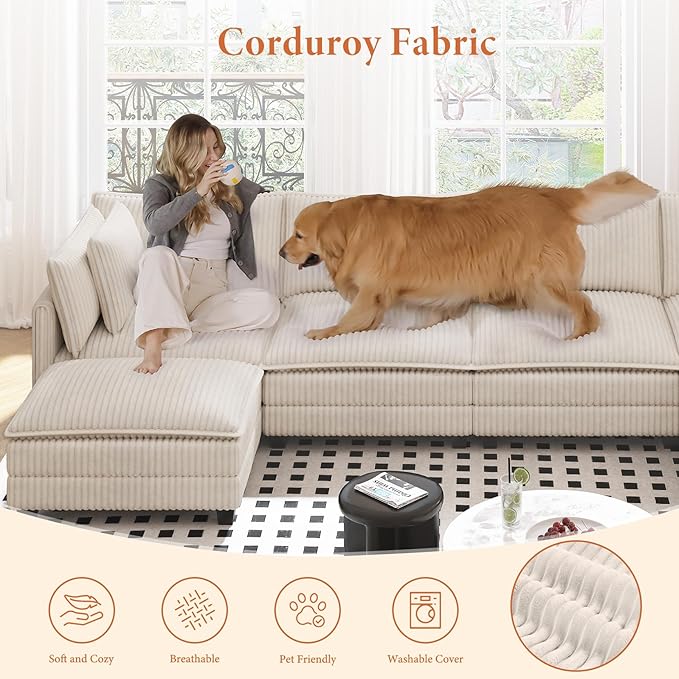 Vesgantti 143" L Shaped Modular Sectional Sofa, Comfy Corduroy Upholstered Modular Sectional Couches for Living Room, Modern Cloud Couch with Ottoman Deep Seat, Beige