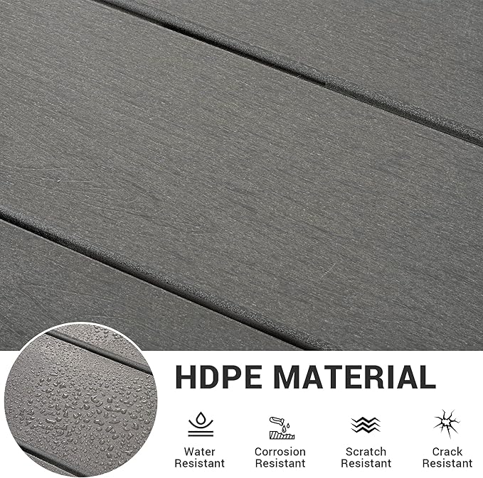 - All-Weather Durability: Made with high-quality HDPE, this patio dining set holds up well against the elements. It supports heavy items easily, resists spills and stains, and maintains its color season after season with UV-stabilized material. Rust-free hardware and sturdy components ensure it lasts through rain, sun, and snow year-round.