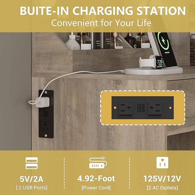 - 【Convenient Charging Station】The vanity mirror with lights desk and chair is equipped with a built-in charging station, including 2 AC outlets and 2 USB ports, allowing you to sit at your makeup vanity and use your hair dryer or curling iron within easy reach and charge your phone, tablet, or other electronics
