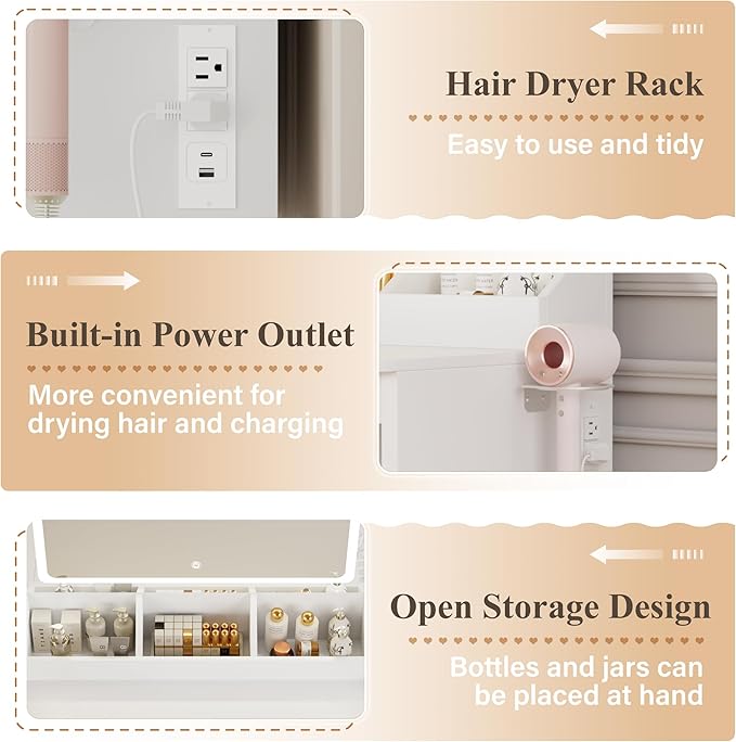 - Multi-functional fast-charging outlets: Integrated USB and Type-C fast-charging modules on the side for efficient charging of beauty devices, smartphones, and more. Say goodbye to the hassle of insufficient outlets and keep your vanity neat and organized.