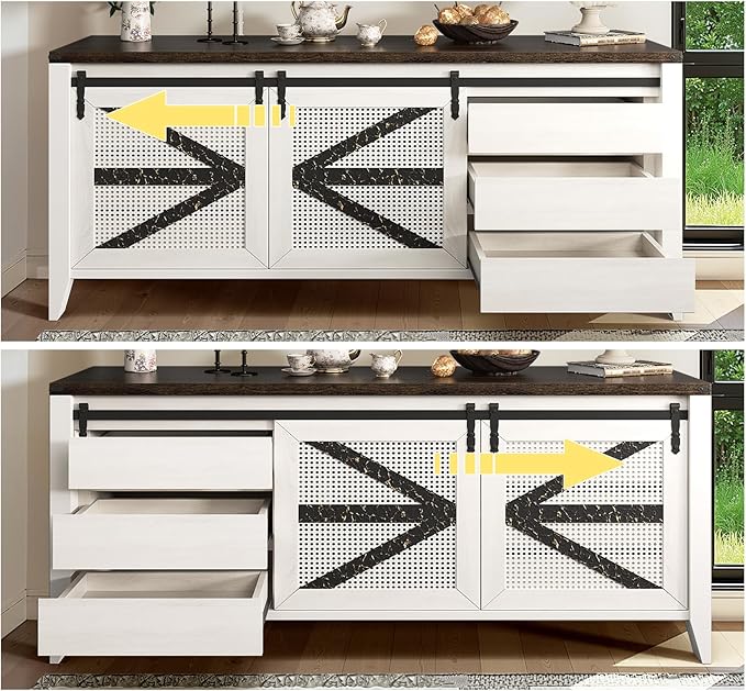 - 【Ample Storage & Display Space with Barn Doors】Side cabinets behind sliding barn doors that have six drawers provide organized hidden storage, while two central open shelves offer space for media devices, books, or decorative items. This design keeps your living room tidy and stylish.