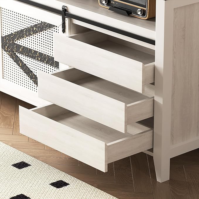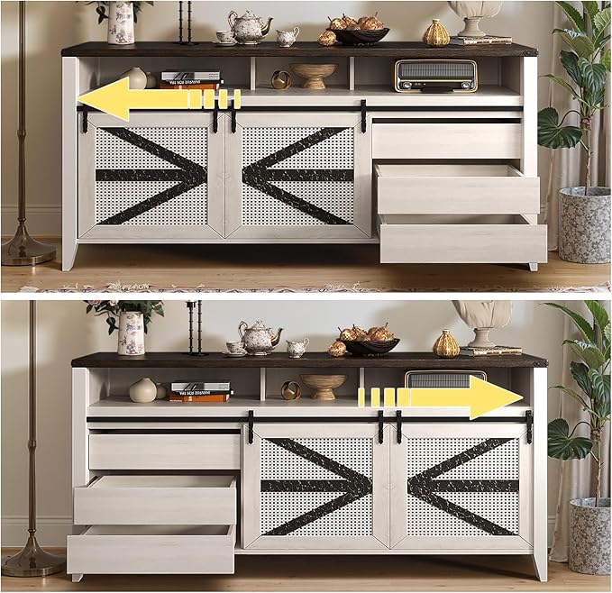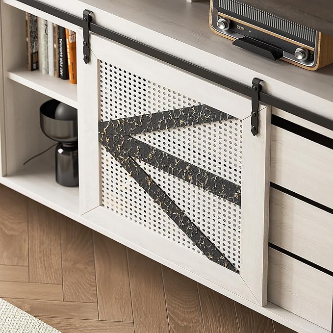 - 【Ample Storage & Display Space with Barn Doors】Side cabinets behind sliding barn doors that have six drawers provide organized hidden storage, while two central open shelves offer space for media devices, books, or decorative items. This design keeps your living room tidy and stylish.