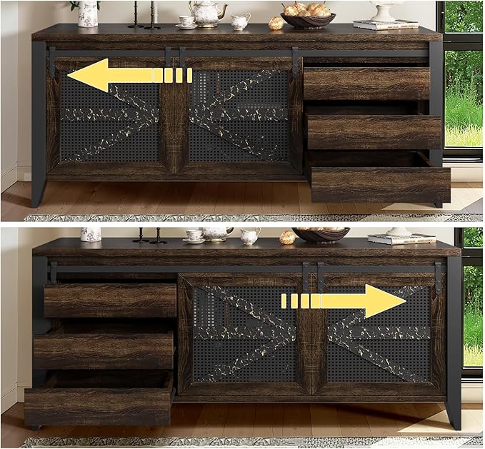 - 【Ample Storage & Display Space with Barn Doors】Side cabinets behind sliding barn doors that have six drawers provide organized hidden storage, while two central open shelves offer space for media devices, books, or decorative items. This design keeps your living room tidy and stylish.