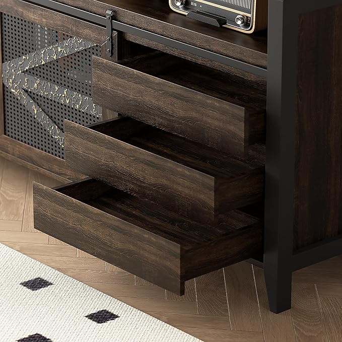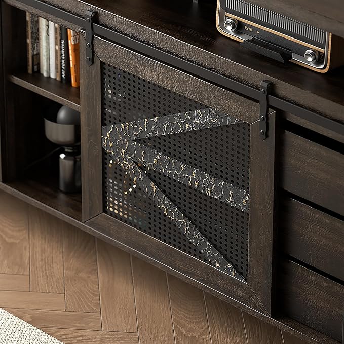 - 【Ample Storage & Display Space with Barn Doors】Side cabinets behind sliding barn doors that have six drawers provide organized hidden storage, while two central open shelves offer space for media devices, books, or decorative items. This design keeps your living room tidy and stylish.