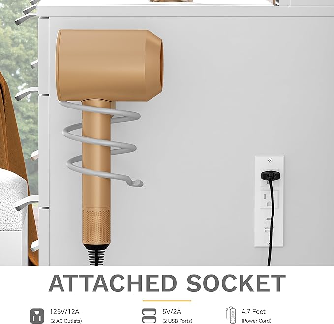 - Built-in Power Station: Stay connected and styled with two standard outlets, two USB ports, and a sleek hair dryer cradle; This versatile makeup desk seamlessly supports your beauty routine, salon work, or live-streaming sessions