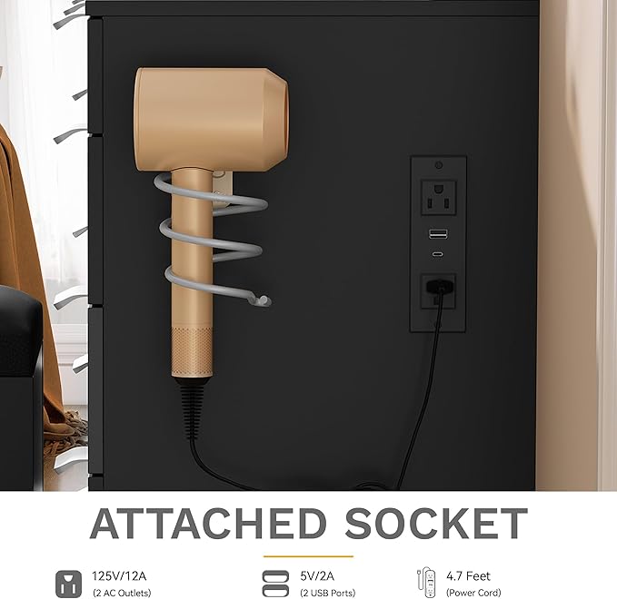- Built-in Power Station: Stay connected and styled with two standard outlets, two USB ports, and a sleek hair dryer cradle; This versatile makeup desk seamlessly supports your beauty routine, salon work, or live-streaming sessions