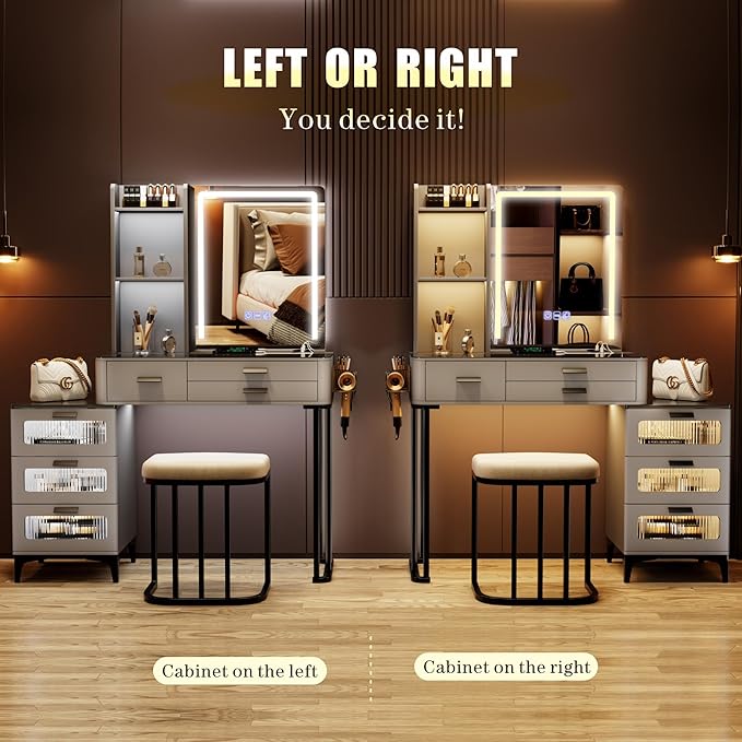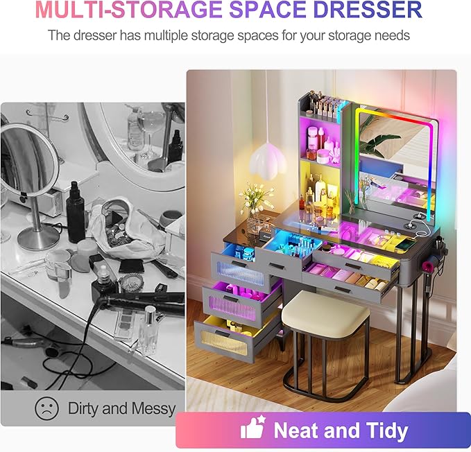 HNEBC Vanitys with HD Glass Display Table, Makeup Desk with Lighted Mirror and Charging Station, Dressing Table with RGB Lights,Jewelry Organizer,Cabinet,6Drawers,Chair for Women/Girls (Grey)