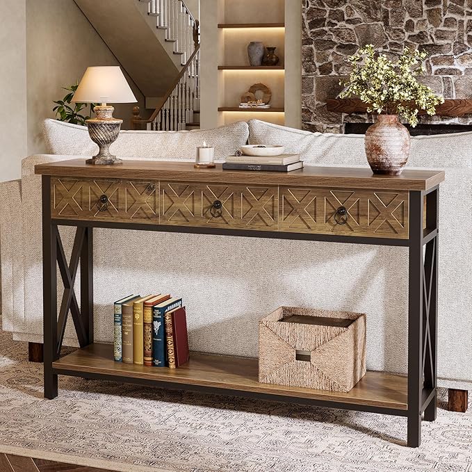 Tribesigns Farmhouse Narrow Console Table with 3 Drawers, 55" Long Rustic Entryway Table with 2-Tier Storage Shelf, Behind The Sofa Furniture for Living Room, Entrance, Hallway, Foyer, Brown & Black