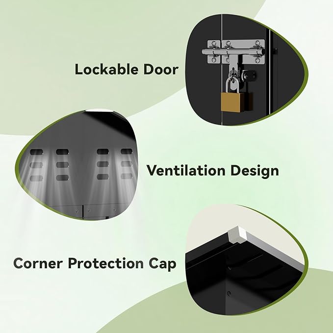 - Lockable Door and Vents:The lockable door provides security,keeps your tools away from being stolen,and avoids small animals from entering accidently;Two Top Vents for Better Airflow,Keeping the Space Cool and Odor-Free