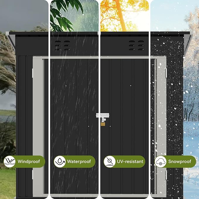 - Waterproof Tool Shed:The sloping roof design of this storage outdoor shed maximizes space utilization;effectively direct rainwater away from the structure to prevents the leakage,Don't worry about your items getting wet