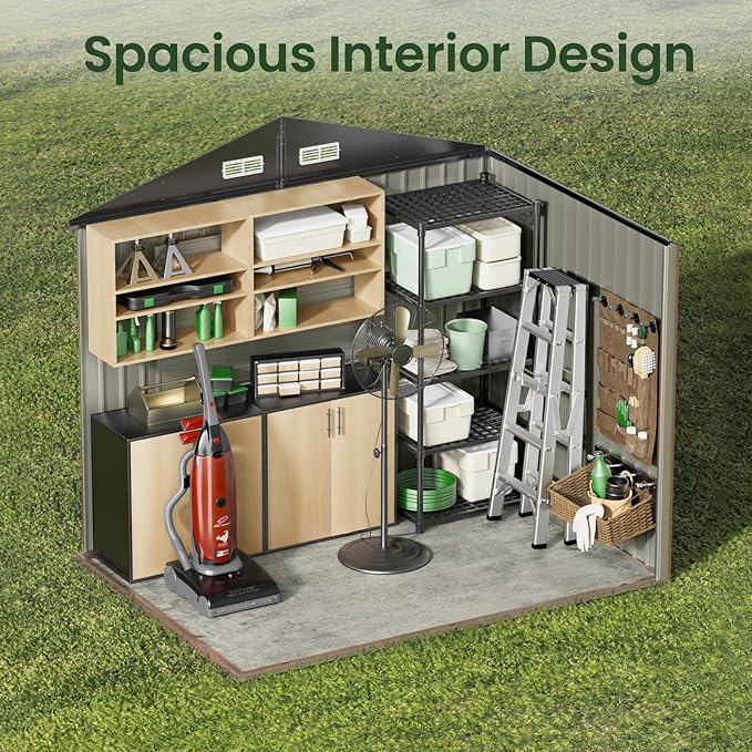 - Spacious & Secure Storage: Our upgraded GVDV Metal Garden Shed is designed for practicality and durability: Roof Dimensions: 7.75' x 5.64' (93"L x 67.7"W) – Providing ample coverage for stored items. Base Dimensions: 7.33' x 5.28' (88"L x 63.4"W x 77.2"H) – Optimized for stability and compatibility with standard outdoor spaces.